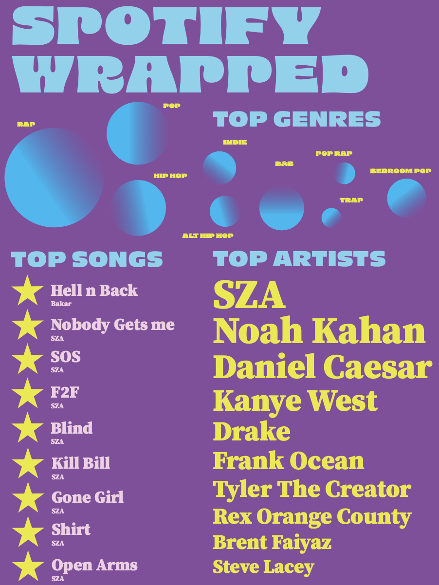 Created for a graphic design course, this project visualizes my personal Spotify Wrapped listening data through an original layout and typography. Designed using Adobe Creative Suite, the piece focuses on visual hierarchy, color, and data presentation to transform listening trends into a clear and engaging graphic. This project demonstrates my ability to translate personal data into visually compelling digital content.